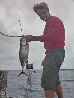 The crew are in relaxed spirits, reading and fishing! In fact it is fishing that has certainly produced both the highs and lows of the day so far! Horatio (a fine blue Danish fishing lure belonging to Peter) succeeded in attracting the first Dorado of the day which was subsequently made into an excellent Norwegian fish soup by Wiggo. Sadly and much to Peter's sorrow Horatio was then taken by a monster from the deep on the next cast never to be seen again! Gloria (my fine pink lure) was then deployed only to attract a small Dorado we named Camilla which we returned to the sea to swim happily away!
